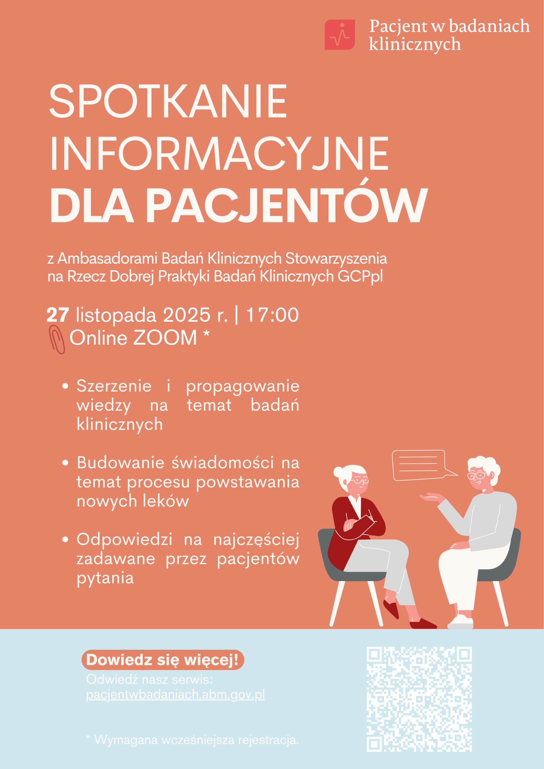 Serdecznie zapraszamy na bezpłatne spotkanie on-line organizowane przez Agencję Badań Medycznych we współpracy z Ambasadorami Badań Klinicznych. Spotkanie dedykowane jest wszystkim osobom zainteresowanym tematyką badań klinicznych, szczególnie pacjentom. Celem spotkania jest szerzenie i propagowanie wiedzy na temat badań klinicznych oraz budowanie świadomości na temat procesu powstawania nowych leków i technologii medycznych.